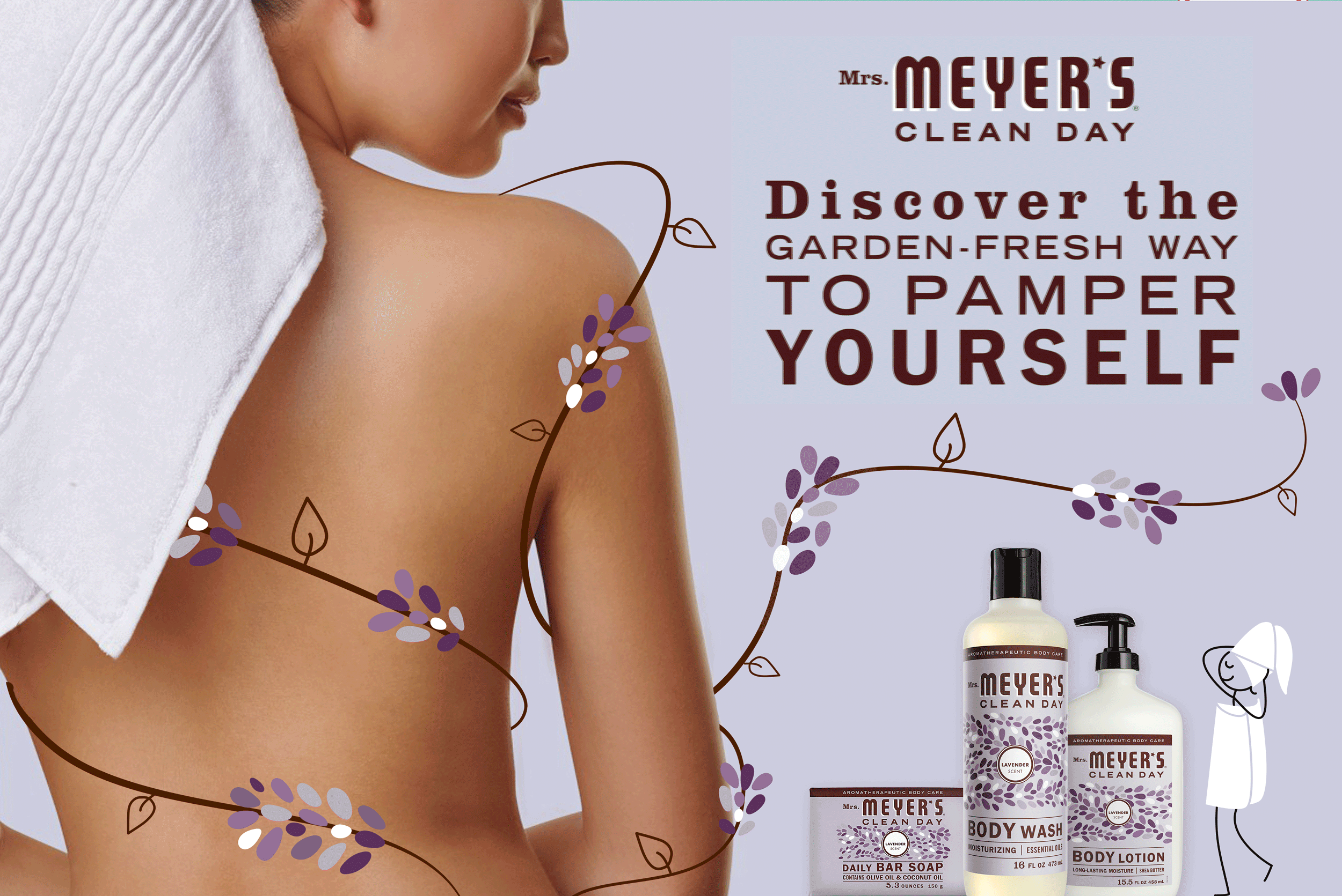To effectively differentiate the personal care products from the cleaning range, the campaign introduced lifestyle imagery and skin visuals for the first time in the brand's marketing materials. This marked a significant shift in visual communication, aiming to clearly signal the new line's focus on body care. The creative approach preserved Mrs. Meyer's whimsical charm by blending their traditional illustrative style with new elements. These included photographs of real women showcasing clean, healthy skin, which were pivotal in immediately conveying the products' intended use. The inclusion of playful illustrations, such as spa-ready versions of the Mrs. Meyer's lady, loofah hot air balloons, and scent cues visually wrapping around models, further enriched the narrative, making the personal care items stand out amidst the crowded market space.