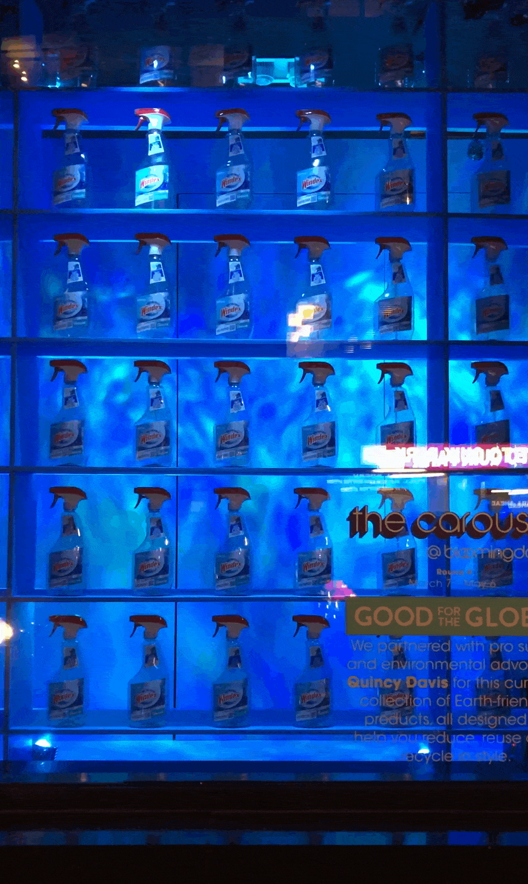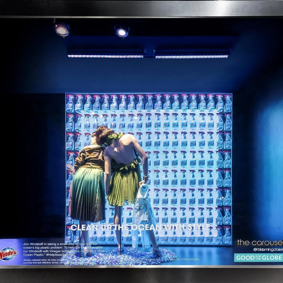 The rollout of this ambitious rebranding campaign involved a multi-faceted approach, incorporating both physical and digital marketing strategies to maximize reach and impact. Leading the rebranding efforts, a high-profile launch event at Bloomingdale's flagship store in New York City prominently featured the Windex Ocean Plastic bottle within their "Good for the Globe" pop-up, among other sustainable brands. This initiative was marked by engaging window displays, influencer collaborations, and giveaways of a limited-edition recycled Bloomie's bag, significantly boosting the product's visibility and appeal to consumers.