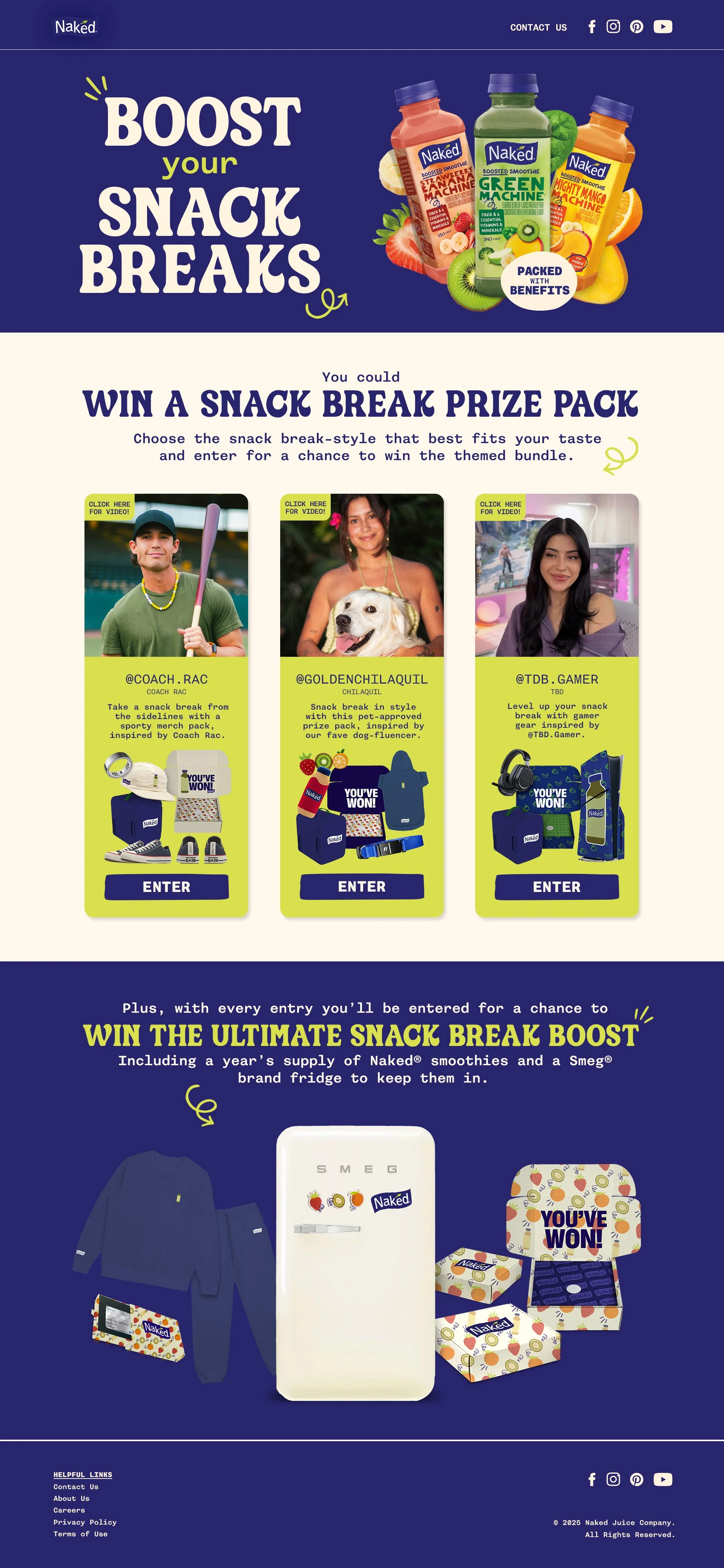A key component of the campaign was a high-impact sweepstakes designed to drive engagement and purchase. With every purchase, consumers could enter to win themed Snack Break bundles (sports, pet, or gaming) that corresponded with the Gen Z influencers they followed. These influencers showcased how they boosted their snack breaks with Naked, creating authentic connections with their audiences and driving excitement around the campaign. The sweepstakes also featured a grand prize: a year’s supply of Naked, a branded Smeg mini fridge, and exclusive Naked swag, ensuring broad appeal and participation.