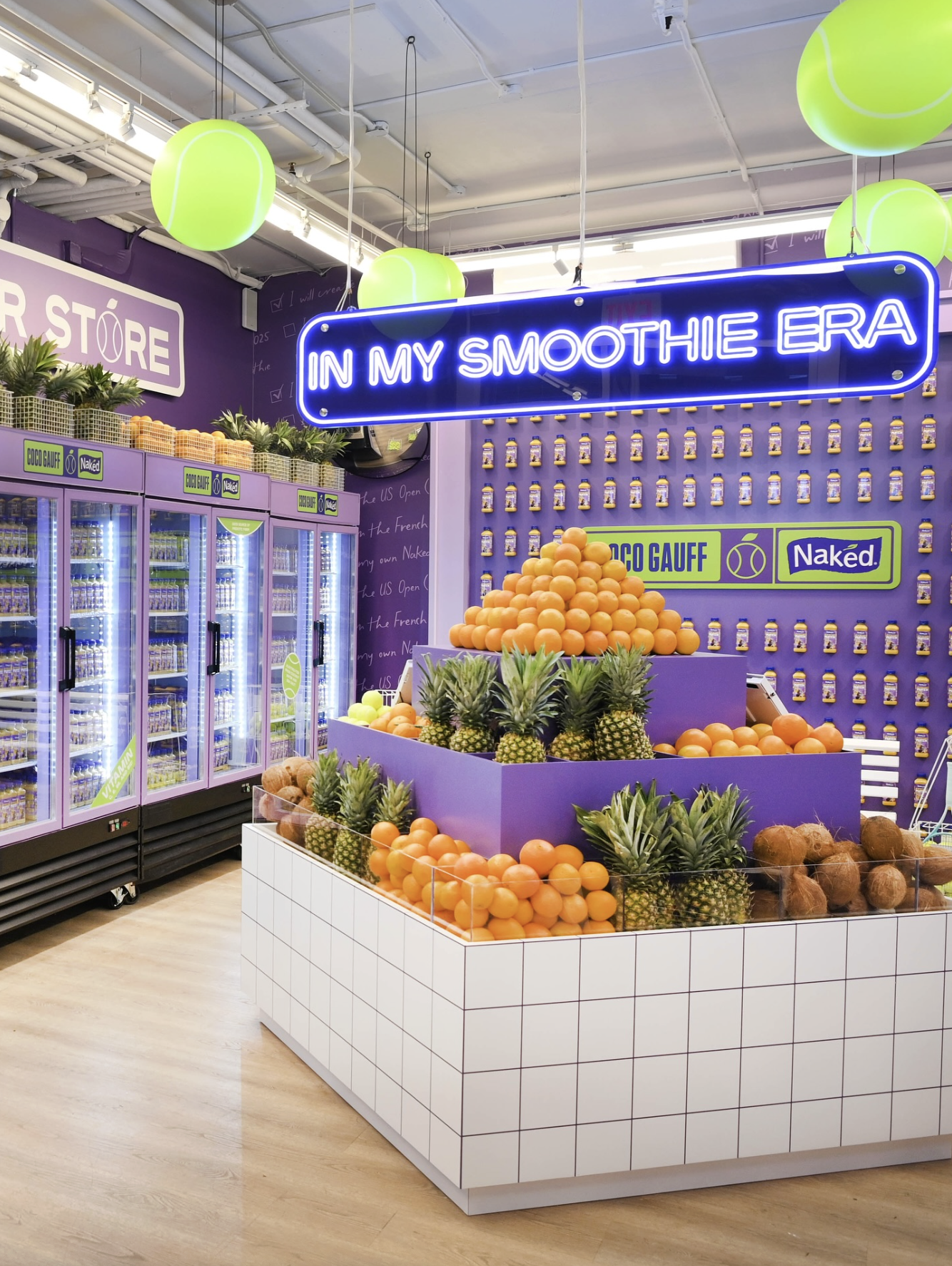 Tennis star Coco Gauff, known for eating fresh fruit courtside, joined the Naked during the restage as Chief Smoothie Officer, bringing star power, authenticity, and a strong Gen Z connection to the brand. Her custom Pineapple Mango Protein Smoothie was launched with a suite of in-store and digital assets designed to amplify its debut. These assets also connected to "Coco’s Corner Store," a dynamic pop-up experience created by partner agency MullenLowe during the US Open in NYC. The pop-up offered interactive activities, exclusive merchandise, and shareable moments, perfectly blending Naked’s vibrant identity with Coco’s energetic presence.